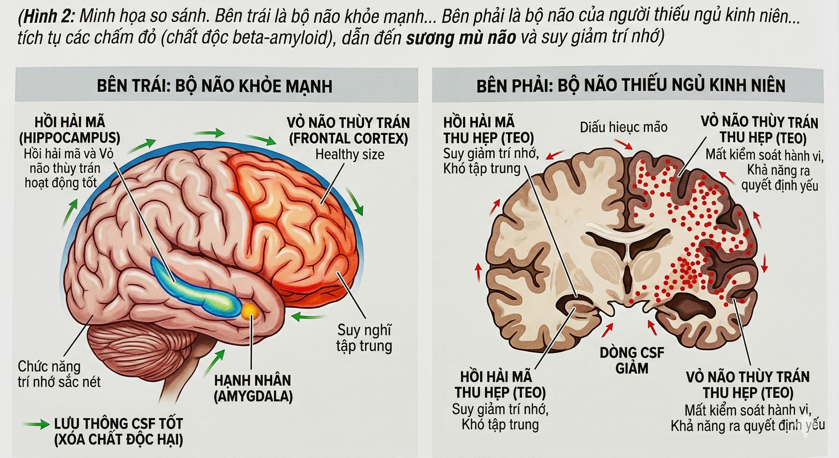 Nhiều nghiên cứu chỉ ra rằng Melatonin giúp ngăn chặn sự hình thành các mảng bám Beta-amyloid – thủ phạm chính gây ra chứng mất trí nhớ (Alzheimer). Khi nồng độ Melatonin đủ cao, hệ thống “dọn rác” Glymphatic hoạt động hiệu quả hơn, quét sạch các mảng bám này ra khỏi não bộ.